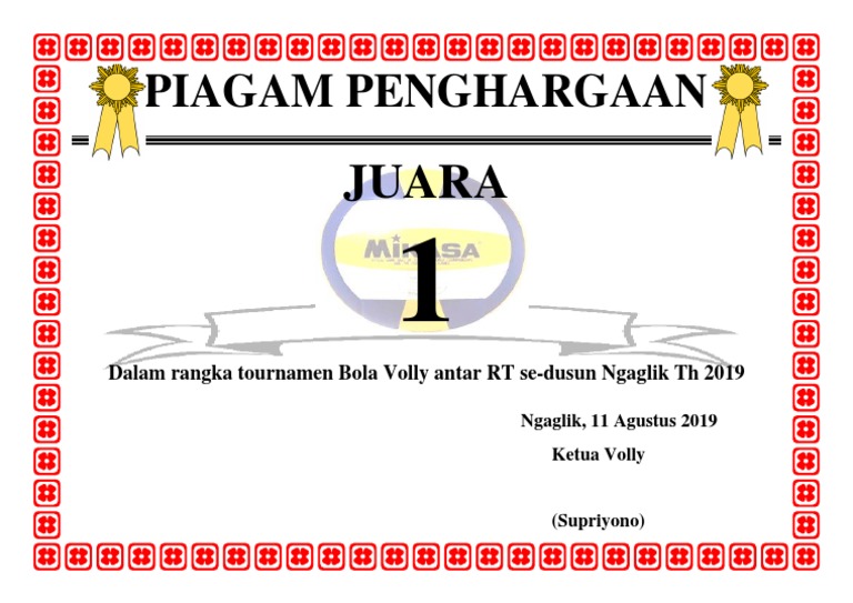 Contoh Piagam Penghargaan Turnamen Vollyball Word Doc Download